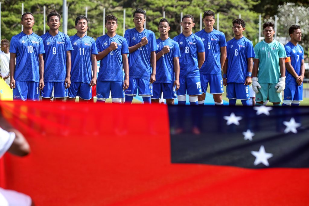 Previous Image OFC U-16 Championship 2018, Samoa v New Caledonia The teams come out to play. OFC U-16 Championship 2018, Samoa v New Caledonia, Lawson Tama Stadium, Honiara, Solomon Islands, Thursday 13th September 2018. Photo: Shane Wenzlick / www.phototek.nz
