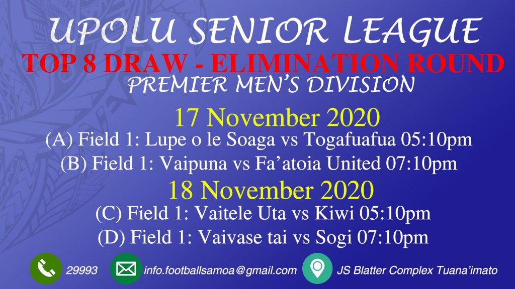 Three exciting matches set for match day 2 of the FFS Upolu senior league elimination round at the JS Blatter Complex, Tuana’imato.